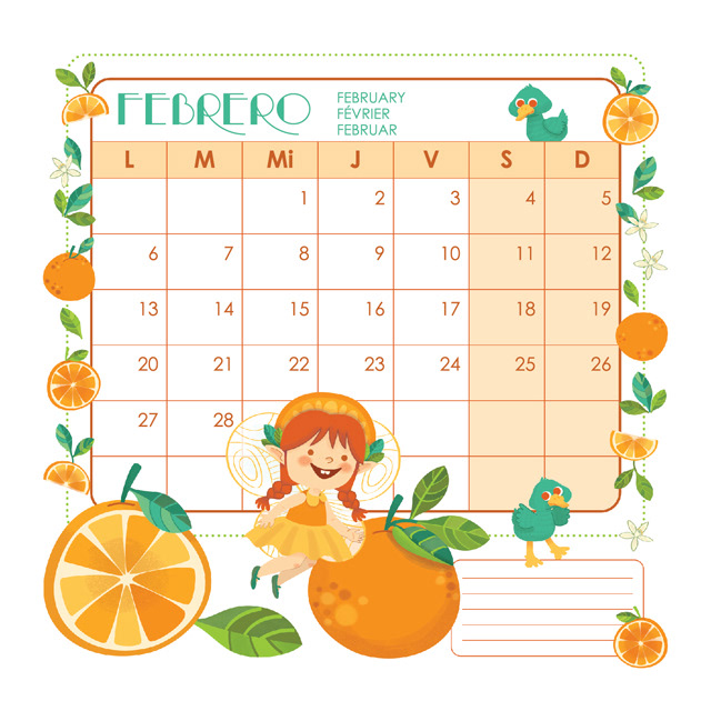 Personal project. A wall calendar filled with cute colorful characters, and inspired on "fruit-fairies" for every season. Available for purchase on my